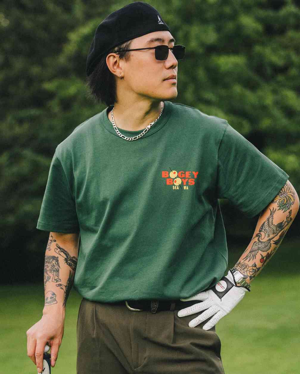 而另一个 Golf Lifestyle 单位 Bogey Boys 则更具松弛感。来自西雅图的 Bogey Boys 在复古街头元素之外,对于服饰工艺细节的打磨深度参考了上世纪 50~60 年代的 IVY style 与美式绅装,各种复古印花细节与重磅针织面料的融入搭建出十分慵懒的高尔夫球场气质,甚至巧妙融入了一些保龄球运动的元素,场内场外均能游刃有余的搭配。