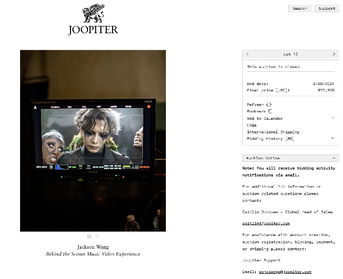 全场最高成交价拍品,是一次参与王嘉尔 MV 拍摄幕后工作的深度体验机会,成交价折合人民币约 56 万元,相比拍前预估的 10,000-15,000 美金(折合人民币约 7.5-11.25 万元),溢价高达 5-7 倍。