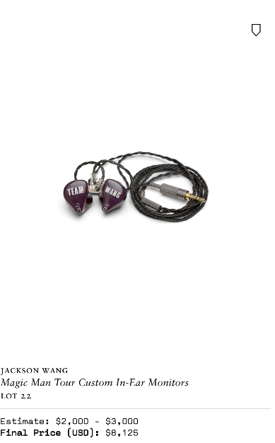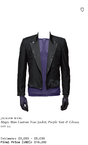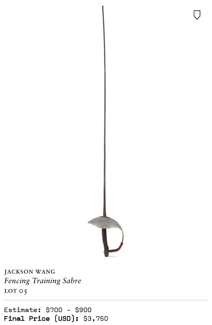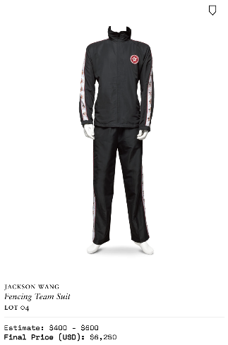 全场最高溢价率、较估价超出 15 倍的王嘉尔运动员时期队服,以及赛场佩剑、全球巡演舞台服装、定制耳机…多件王嘉尔出道前后不同时期的亲穿亲用物品、特殊意义单品,都以高昂价格成交;而其中买家,有不少都来自中国粉丝群体。