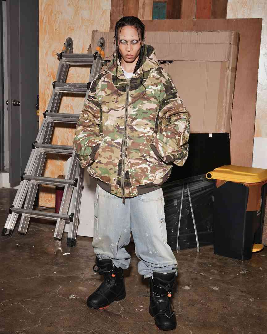 这一系列融合了先锋和街头时尚,结合新复古潮流,推出了宽松的皮革飞行员夹克和解构的迷彩连帽夹克,完美展现了 PROJECT G/R 一如既往的先锋和叛逆时尚风格。