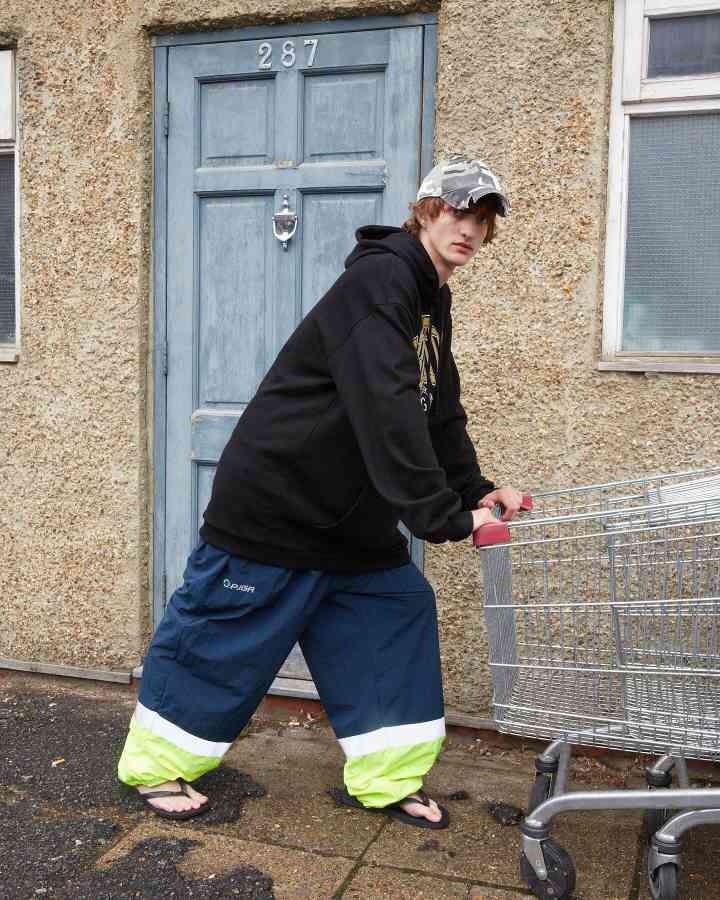 拿这条迷彩裤举例和大家介绍一下。通常来说迷彩被用于在战场上隐藏自己,但我们的用迷彩的想法是为了更显眼,让人们能够注意到我。而在此基础上,我们想要把迷彩做得更夸张,所以就将它的版型做得很宽、很长,这和它原有的设定有点像是悖论。