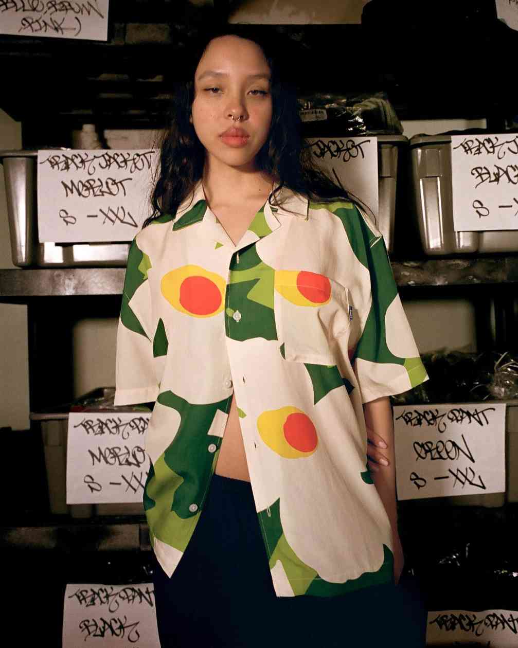 同时对比追求轻薄垂坠感的夏威夷衬衫来说,保龄球衬衫在面料层面有着丰富的多样性,既有契合盛夏的真丝或尼龙,也有硬挺的重磅纯棉,甚至可以根据原有廓形打造出镂空针织版本,在这丰富的选择中对于着用者而言没有任何年龄、性别以及风格上的局限,从「Grandpa Shirt」转变为 Z 世代的衣橱必备,也可以认为是年轻一代对印花短袖T恤审美疲劳的一个承接。