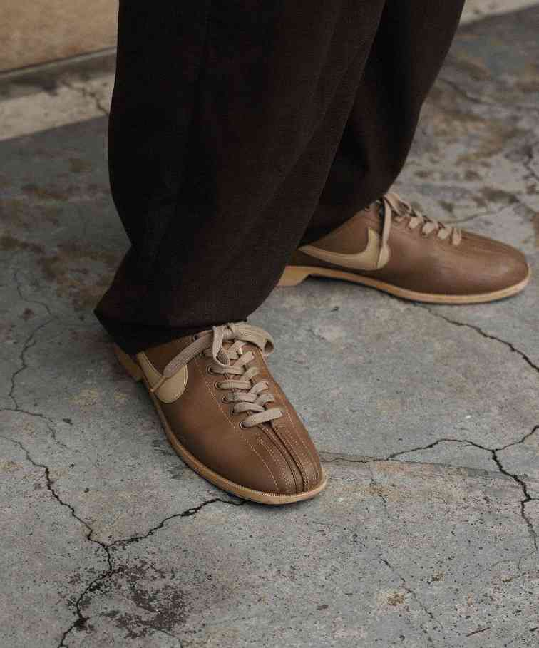 除了在穿搭层面带来全新的复古氛围之外,脱胎于古早足球鞋的复古保龄球鞋在当下审美语境中更像是半成品,有着很大的 DIY 空间。知名球鞋客制专家 Jakob Werner 在拿到实物后第一时间为前掌贴上了 VIBRAM 大底,延长使用寿命且为整体增添不少层次感。复古保龄球鞋介于正装鞋与球鞋之间的形态确实能为后球鞋时代的穿搭造型注入些许活力,极简的鞋身与对称的廓形设定同时也是联名企划天然的创作画板,可以延伸出多种玩法。